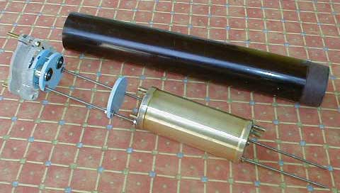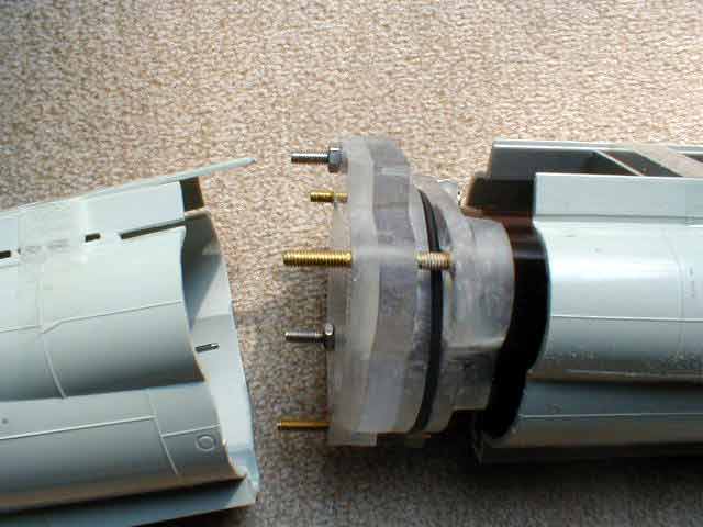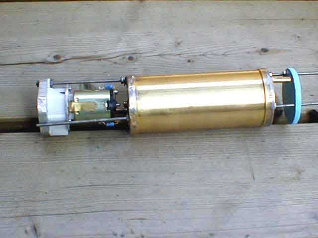| gut zu sehen die achtern noch nicht eingeklebte Verschlusseinheit mit dem O-Ring als Abdichtung zum Druckkörper | Der Druckkörper und darunter das Montagegerüst. Gut zu sehen die beiden Motoren (links) und der Tank (er ist bestimmt zu groß - aber besser als zu klein) |